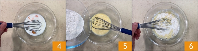 Mix de ingrediënten met een garde 4, voeg dan de gezeefde bloem toe 5 en roer goed zodat er geen klontjes ontstaan 6.