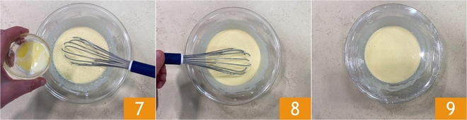 Voeg de licht afgekoelde gesmolten boter toe 7 en meng nogmaals 8. Dek de kom af met folie en laat het beslag 30 minuten rusten in de koelkast 9.