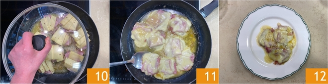 Dek af met het deksel 10 en laat nog ongeveer 3 minuten doorgaren, precies genoeg zodat de kaas smelt en het vlees romig en draadjesachtig omhult. Wanneer de fontina volledig gesmolten is en de jus goed is ingekookt, zet je het vuur uit en controleer je de textuur van de scaloppine: ze moeten zacht en sappig zijn 11. Leg ze vervolgens op serveerschalen en nappé ze met hun jus. Serveer je scaloppine alla valdostana meteen 12!
