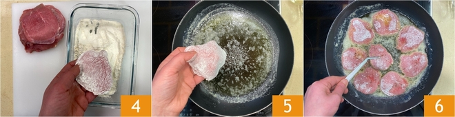 Haal daarna elk plakje door de bloem, druk licht aan en schud het overtollige er af 4. Leg de scaloppine in de hete pan 5 en bak ze op middelhoog tot hoog vuur een paar minuten per kant, tot ze goudbruin zijn 6; breng tijdens het bakken op smaak met zout en peper naar smaak.