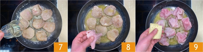 Als het vlees goed gebruind is, blus je af met de witte wijn en laat je de alcohol volledig verdampen, zodat je een geurige en smaakvolle jus overhoudt 7. Zet het vuur iets lager en verdeel op elk vleesplakje een plakje gekookte ham 8 en een plakje fontina 9.