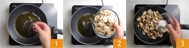 Om de varkenslende in de pan te bereiden begin je met het schoonmaken van de champignons. Snijd het uiteinde van de steel af, dat meestal aarde bevat, en verwijder het velletje dat de hoed bedekt. Maak de champignons schoon met een schone, vochtige doek om eventuele aarde te verwijderen. Doe in een pan 15 g olie, genomen uit het totaal, voeg een knoflookteen in de schil toe en laat deze aanbakken 1. Voeg de champignons toe 2 en breng op smaak met zout 3.