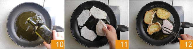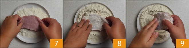 Wentel beide zijden van de plakjes door de bloem 7 8 en schud het overtollige eraf 9.