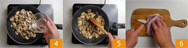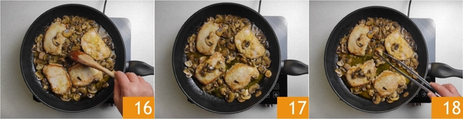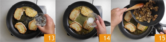 Blus af met witte wijn 13 en laat de alcohol verdampen. Breng op smaak met zout 14 en zet op laag vuur nog 10 minuten verder te garen. Voeg dan de champignons met al hun braadvocht toe 15.
