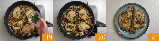 Voeg tenslotte de fijngehakte peterselie toe 19 20. De varkenslende in de pan is klaar 21; serveer hem met het bijbehorende braadvocht.