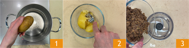 Om het vegan gehaktbrood te maken, begin je met de aardappel met schil te koken 1 en na ongeveer 30-40 minuten is hij gaar; pel hem dan en prak hem met een vork 2. Giet intussen de voorgekookte linzen in de kom van de blender 3.