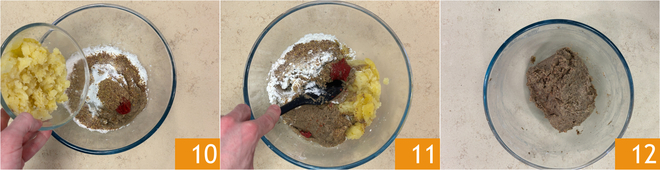 Voeg nu de gekookte aardappel toe 10, breng op smaak met zout en peper en meng goed met een spatel 11 totdat het de juiste consistentie heeft 12.