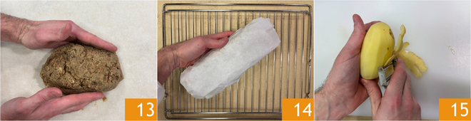Leg het op een vel bakpapier en vorm het mengsel tot de klassieke gehaktbroodvorm 13. Vouw de uiteinden dicht als een snoepje en laat het een nacht in de koelkast rusten. De volgende dag leg je het op een rooster en bak je het in een voorverwarmde oven op 220°C (boven- en onderwarmte) gedurende circa 40 minuten 14. Als je wilt, kun je er geroosterde aardappels bij serveren. Nadat je ze hebt gewassen, schil ze 15.