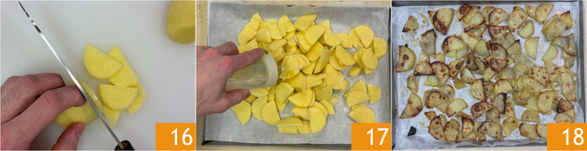 Halveer ze en snijd ze in halve maantjes 16, leg ze op een bakplaat met bakpapier, besprenkel met olie en zout 17 en bak ze in de oven (ook tegelijk met het gehaktbrood, zelfde temperatuur en baktijd) 18.
