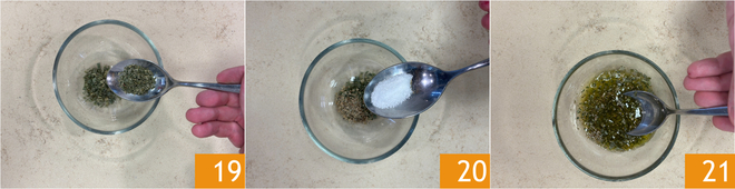 Maak het kruidenmengsel: doe tijm en rozemarijn in een kom 19, voeg zout toe 20 en olie en meng 21.