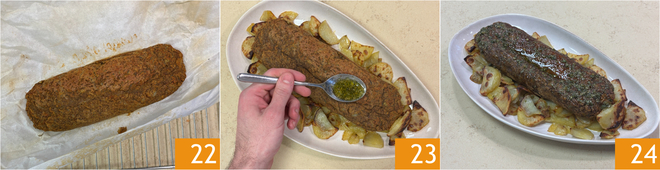 Het gehaktbrood is nu gaar 22, bestrijk de bovenkant met het zojuist gemaakte mengsel 23 en serveer je vegan gehaktbrood met de aardappels 24.