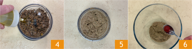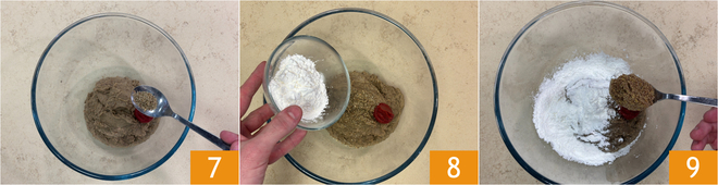 Vervolgens de aromatische kruiden 7, de tomatenpuree en het maïszetmeel 8 en tot slot het lijnzaad dat je tot poeder hebt vermalen 9.