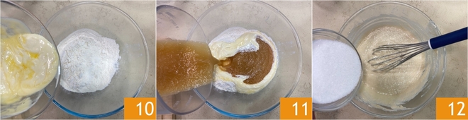Doe de bloem in een kom en voeg de plantaardige boter toe, die je van tevoren hebt laten smelten 10, en de appelpuree 11. Meng goed met een garde en voeg daarna de suiker toe 12.