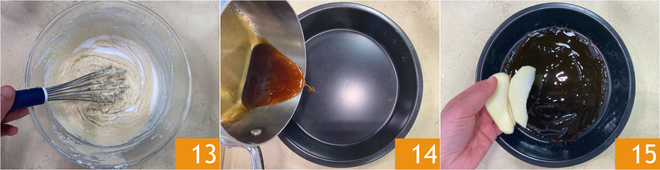 Roer nogmaals tot je een homogeen beslag hebt 13. Giet nu de hete karamel in een taartvorm met een bodemdiameter van 22 cm en een bovenkant van 25 cm 14, en verdeel daarna de appelpartjes zodat de hele bodem bedekt is 15.