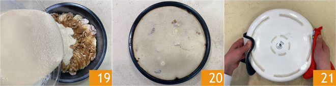 Bedek de appels met het beslag 19 en bak in een voorverwarmde oven op 180 b0 (zonder hetelucht) gedurende ongeveer 45 minuten 20. Controleer de gaarheid met een satéprikker, haal de taart uit de oven en keer hem direct om met behulp van een bord; let daarbij op dat je je niet brandt 21.