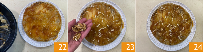 Verwijder voorzichtig de bakvorm 22 en laat de taart afkoelen. Garneer het oppervlak met de achtergehouden pijnboompitten en walnoten 23 en serveer je vegan omgekeerde appeltaart 24!