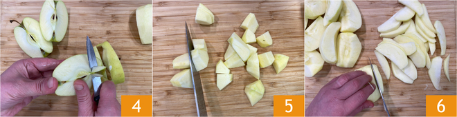 Maak ondertussen de appels schoon 4: snijd 200 g vruchtvlees in blokjes 5 en de rest in dunne plakjes 6, die je opzij legt.