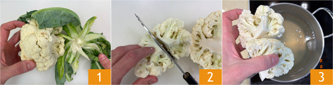 Om de vegan ovenschotel met bloemkool te maken, maak je eerst de groentebouillon volgens ons recept. Maak de bloemkool schoon door de onderkant en de bladeren te verwijderen 1, snijd hem grof 2. Kook de bloemkool in de groentebouillon ongeveer 15 minuten, of totdat hij zacht is geworden 3.