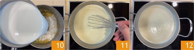 Als er belletjes verschijnen, voeg dan de hete plantaardige melk toe 10 en blijf op het vuur roeren 11 tot je een dikke en egale consistentie hebt bereikt 12.