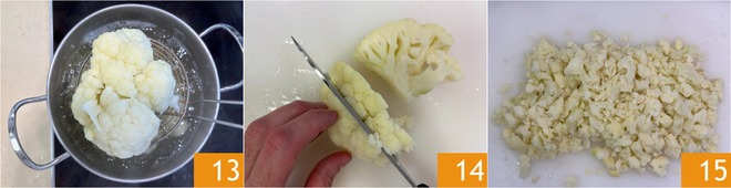 Intussen is de bloemkool klaar; giet hem af 13 en hak hem grof 14 15.
