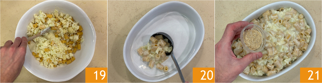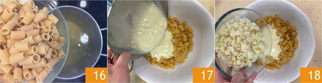 Kook de pasta in de bouillon waarin je de bloemkool hebt gekookt 16. Giet de pasta al dente af en voeg dan de bechamelsaus 17 en de bloemkool toe 18.