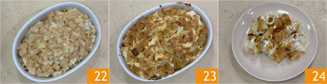 Roer goed zodat alles goed gemengd is 19. Doe de pasta met saus in een ovenschaal 20, bestrooi het oppervlak met vlokken voedingsgist 21 en besprenkel met een scheutje olie.