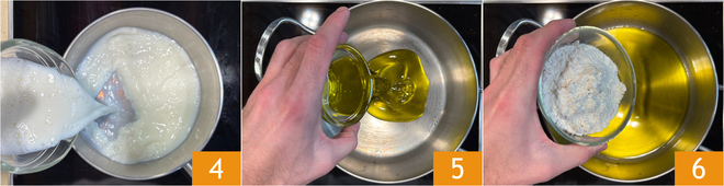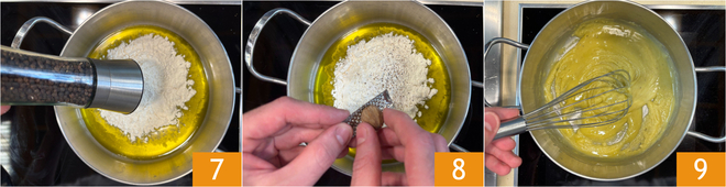 Maak ondertussen de bechamelsaus zonder boter: giet de havermelk in een steelpan 4 en breng deze tot net tegen het kookpunt. Doe in een andere steelpan de olie 5 en de bloem 6.