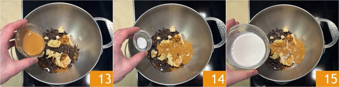 Voeg ook de pindakaas 13, het zout 14 en de kokosmelk 15 toe.