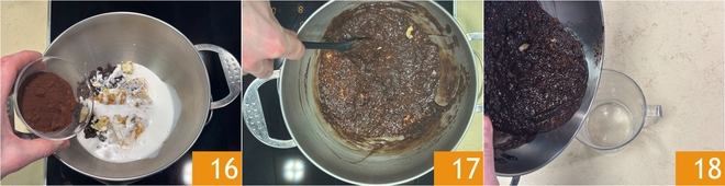 Maak het af met cacaopoeder 16, roer goed door en verwarm ongeveer 10 minuten tot alles gesmolten en glad is 17. Giet het mengsel in een schenkkannetje 18.