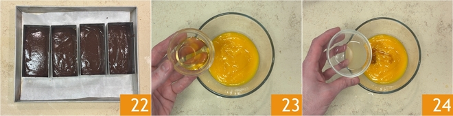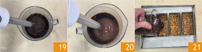 Emulgeer met een staafmixer 19 zodat de ganache glad en homogeen wordt 20. Giet deze in de vormpjes 21, tik vervolgens met de vorm op het werkblad om te egaliseren en eventuele luchtbellen te verwijderen.