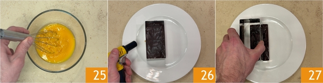 Roer door en zet opzij 25. Na de rusttijd haal je de terrines uit de vormpjes; om het te vergemakkelijken kun je de rand van de vorm kort met een keukenbrander verwarmen voor een paar seconden 26 27.