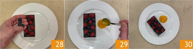 Garneer met verse bosbessen en frambozen 28, voeg een paar takjes dille toe en schep de mangosaus ernaast 29. De veganistische chocoladeterrine met pinda's en bosvruchten is klaar om geserveerd te worden 30!