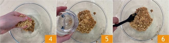Voeg de pinda's toe aan het gepureerde dadelvlees 4, voeg dan ook de kokosolie toe 5 en meng alles met een spatel of met de hand 6.