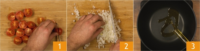 Om vermicelli alla montanara te bereiden, zet je eerst een pan met ruim water op het vuur en breng je die aan de kook om de pasta te koken. Was en halveer de cherrytomaatjes 1, snijd de ui en hak die fijn 2. Verwijder het vel van de worst en verkruimel de worst grof. Verhit een koekenpan met een scheutje olie 3.