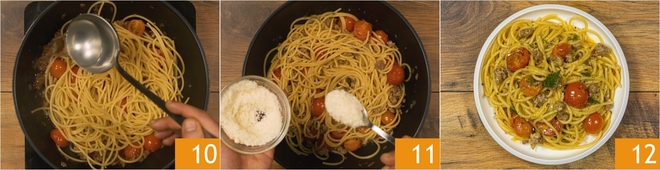 Meng alles goed door elkaar en voeg een soeplepel van het kookvocht toe 10, haal dan de pan van het vuur en roer er geraspte Pecorino door 11. Serveer je vermicelli alla montanara met versgemalen zwarte peper naar smaak 12!