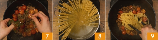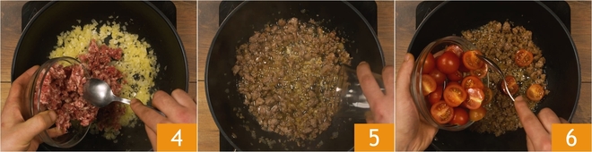 Fruit de ui 3-4 minuten, voeg dan de worst toe 4. Als de worst goed gebakken is, blus je met de witte wijn 5 en laat je de alcohol volledig verdampen. Voeg de cherrytomaatjes toe 6 en breng op smaak met zout en peper.
