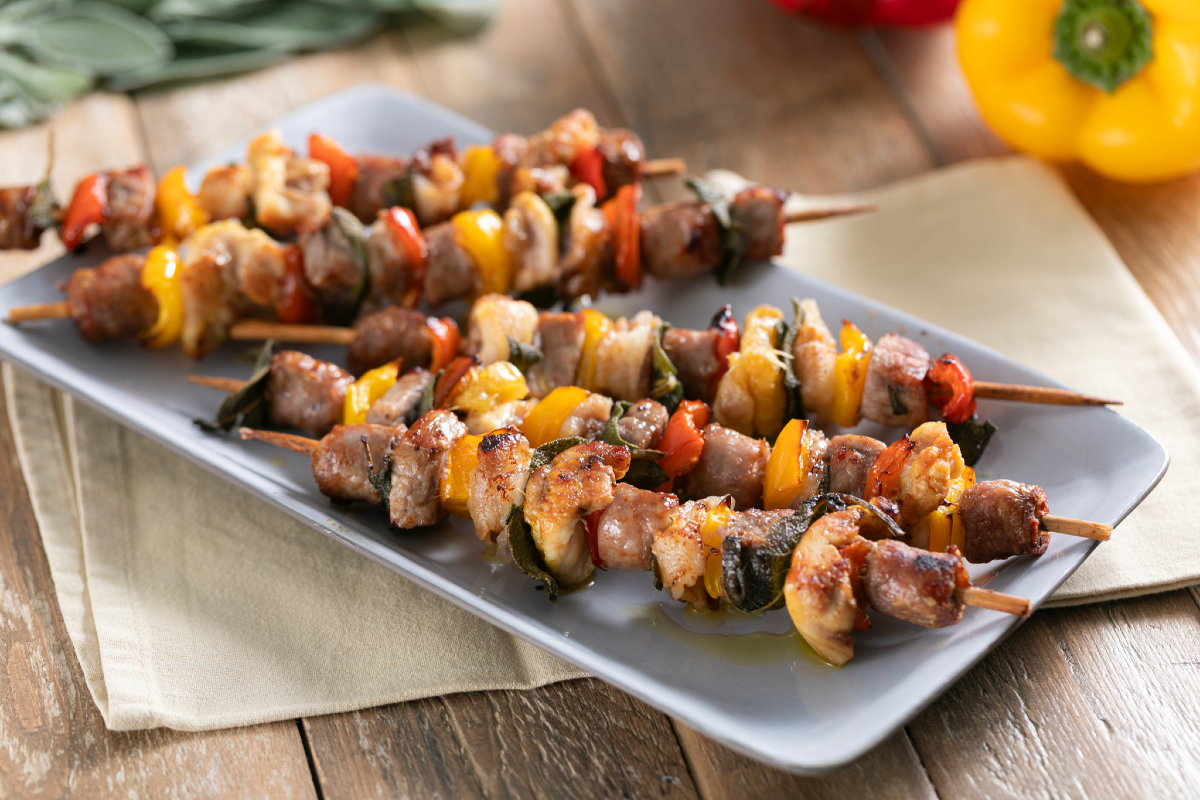 Perfect voor een gezinsetentje, een snelle lunch of een informele samenkomst met vrienden; ze maak je in een paar stappen: je hoeft alleen de blokjes van worst, kip, kalfsvlees en spek af te wisselen met de paprika's in blokjes, te besprenkelen met een scheut olie, er wat salieblaadjes tussen te leggen en de airfryer het werk te laten doen.