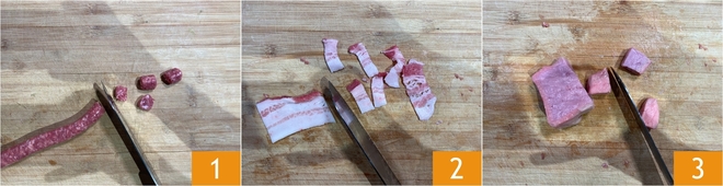Om de vleesspiesjes in de airfryer te maken, begin je met het in stukjes snijden van de varkensworst zonder het darmomhulsel te verwijderen 1. Snijd daarna het varkensspek in reepjes van 2 cm dik 2 en snijd de kalfsvleesfilet in blokjes van 2 cm 3.