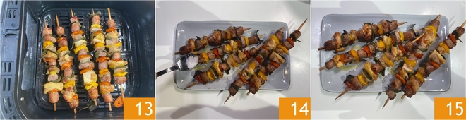 Bak op 160° gedurende 13 minuten 13, draai ze halverwege de baktijd om. Breng op smaak met zout 14 en serveer je vleesspiesjes uit de airfryer direct 15!