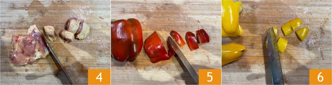 Snijd ook de ontbeende kipdijen in stukjes van 2 cm, en snijd vervolgens zowel de rode paprika's 5 als de gele paprika's 6 in blokjes.