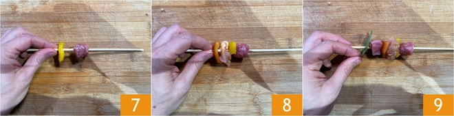 Nu alle ingrediënten klaar zijn, ga je de spiesjes samenstellen: rijg op de prikkers een stuk worst en een stuk paprika 7, vervolg met het spek en nog een stuk paprika 8. Voeg het kalfsvlees toe en een salieblaadje 9.