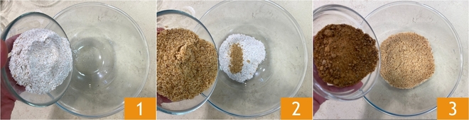 Om de volkorenkoekjes met noten en zaden te bereiden, doe je in een grote kom het volkorenmeel 1, het hazelnootmeel 2 en de muscovadosuiker 3.