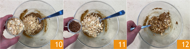 Voeg tenslotte de amandelschaafsel 10 en het lijnzaad 11 toe. Meng alles totdat je een homogeen deeg krijgt 12.