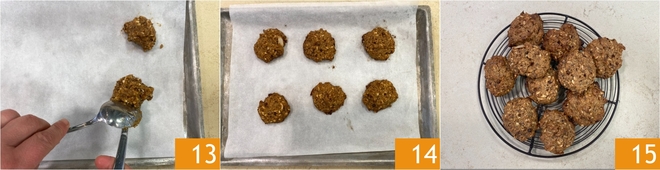 Vorm de koekjes door per keer ongeveer 35 g deeg te gebruiken en deze met behulp van 2 lepels op een met bakpapier beklede bakplaat te laten glijden 13; met deze hoeveelheden maak je ongeveer 10 koekjes. Bak in een voorverwarmde conventionele oven op 180°C, haal ze uit de oven en laat afkoelen 14. Je volkorenkoekjes met noten en zaden zijn klaar om van te genieten 15!