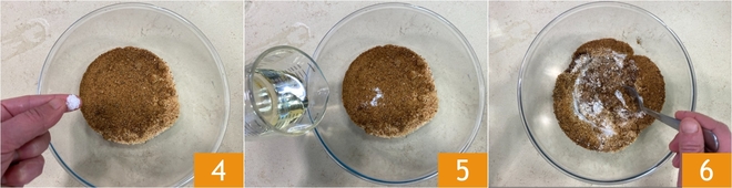 Voeg een snufje zout toe 4, giet vervolgens geleidelijk de olie 5 erbij en roer met een lepel 6.