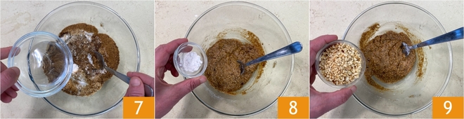 Doe hetzelfde met het water 7. Voeg ook het bakpoeder voor gebak 8 toe en meng daarna de gehakte hazelnoten 9 erdoor.