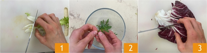 Om de winterse pastasalade te maken, begin je met de groenten: neem de witlof en haal de stronken los van de kern, snijd vervolgens de stelen in stukjes van ongeveer 4 cm 1. Verwijder de steeltjes van de rucola en verzamel de blaadjes in een kom 2. Verwijder het witte binnenste van de radicchio 3.