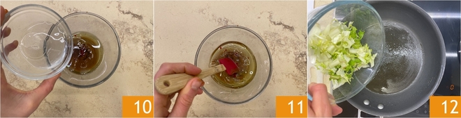Verdun de saus met water 10 en roer goed door 11, zet de dressing daarna even apart. Ga verder met het bakken van de groenten: verhit in een koekenpan de zonnebloemolie en voeg alleen de stelen van de witlof toe 12.