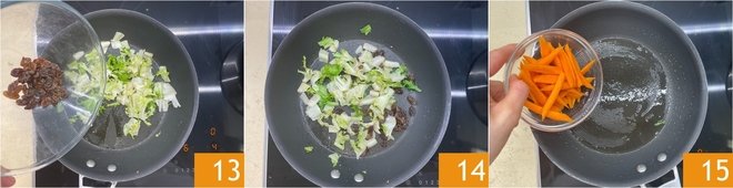 Voeg de rozijnen toe, breng op smaak met zout en bak op middelhoog vuur 3-4 minuten tot ze licht zacht zijn 14. Zet alles apart en verwarm in dezelfde pan de sesamolie, voeg dan de wortels toe 15.