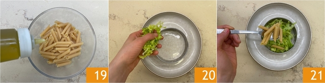 Zet ze over in een kom en breng op smaak met extra vergine olijfolie 19. Alles is nu klaar om de salade in lagen op te bouwen: leg in een ronde ringvorm met een diameter van 11 cm de witlofstronken die je apart had gehouden 20, voeg daarna de pasta toe 21.